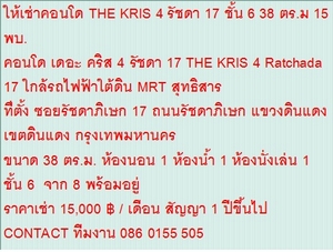 ให้เช่าคอนโด THE KRIS 4 รัชดา 17 ชั้น 6 38 ตร.ม 15พบ. / ให้เช่าคอนโด THE KRIS 4 รัชดา 17 ชั้น 6 38 ตร.ม 15