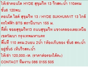 ให้เช่าคอนโด ไฮด์ สุขุมวิท 13 / HYDE SUKHUMVIT 13 หรู ทำเลทอง ใจกลางสุขุมวิท อยู่ระหว่างรถไฟฟ้า BTS ถึง2สถานีคือ สถานีนานา และสถานีอโศก และสถานีรถไฟฟ้าใต้ดินMRTสุขุมวิท และอยู่ใกล้ Terminal21Robinson Nana square ให้เช่า Hyde condo สุขุมวิท13 พื้นที่ 110 ตรม.2นอน 2น้ำ 1ห้องเก็บของ ชั้น6 มีอ่างอาบน้ำในห้องนอนใหญ่ ตกแต่งวัสดุคุณภาพ สระน้ำอยู่ชั้น5 เห็นวิวสระน้ำ ให้เช่า 120000.-/ด. (ราคาต่อรองได้คะ)
