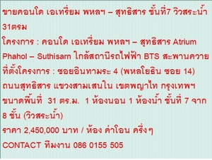 ขายคอนโด เอเทรี่ยม พหลฯ – สุทธิสาร ชั้นที่7 วิวสระน้ำ 31ตรม
