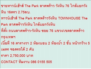 ขายTOWNHOUSE The Park ลาดพร้าววังหิน 16 ตารางวา ราคา 2.75 MB. 2 ชั้น สวย / ขายTOWNHOUSE The Park ลาดพร้าววังหิน 16 ตารางวา รา