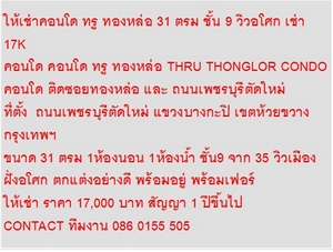 ให้เช่าคอนโด ทรู ทองหล่อ 31 ตรม ชั้น 9 วิวอโศก เช่า 17K