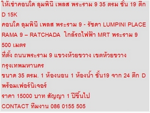 ให้เช่าคอนโด ลุมพินี เพลส พระราม 9 35 ตรม ชั้น 19 ตึก D 15K