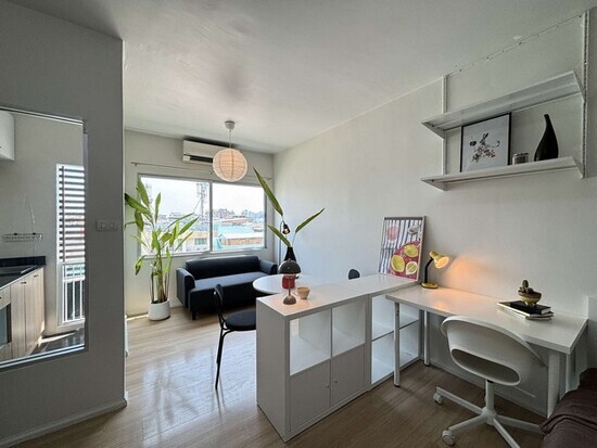 สิ่งอำนวยความสะดวกภายในห้อง : ที่นอน โต๊ะเก้าอี้ทำงาน โต๊ะเก้าอี้ทานอาหาร โซฟานั่งเล่น ตู้เสื้อผ้า ชั้นวางของ บิ้วอินครัว ตู้เย็น ทีวี