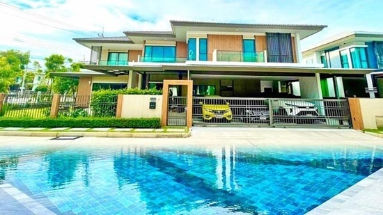 2-storey luxury mansion the largest Pakkret Hospital2 350m. 6bed DBS Inter School 5km. on the main road 345 private corner house 110 sq.w.361 sq.m. public park location quiet 6 bath fully furnished luxurious comfortable complete utilities 104,999 B-M Robinson Ratchaphruek 1.5 km. convenient transportation Ratchaphruek Road.Burasiri