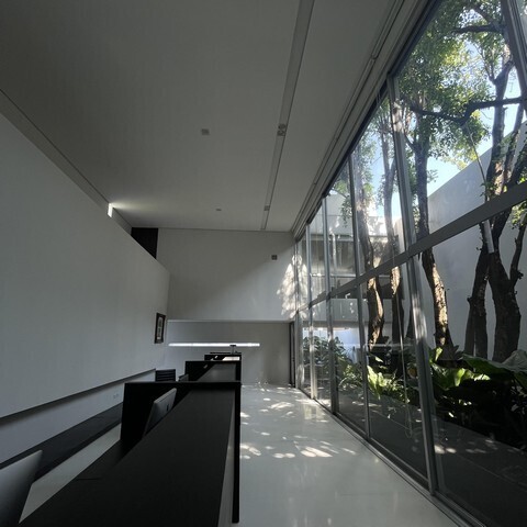 ภายในโปร่งโล่งสบายโถงทำงาน ห้องประชุม ห้องครัว ห้องทำงาน/นอน 4 ห้อง ห้องน้ำ 6 ห้อง มีบรรยากาศทุกห้องเชื่อมกับวิวธรรมชาติทั้งในอาคารและรอบอาคาร