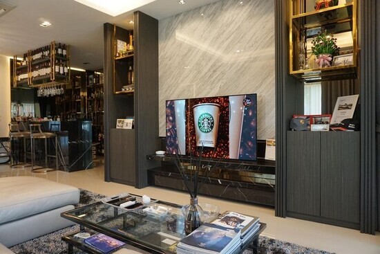 - ห้องนั่งเล่นโซฟาขนาดใหญ่(2แสนบาท)พร้อมทีวี SONY OLED 65 นิ้ว ด้านหลังตกแต่งด้วยหินแท้ขนาดใหญ่แผ่นเดียวไม่มีรอยต่อ