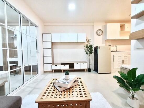 พื้นที่ใช้สอย 32 ตารางเมตร จำนวน 1 ห้องนอน 1 ห้องน้ำ 1 ห้องครัว+ระเบียง แอร์ 1 เครื่อง