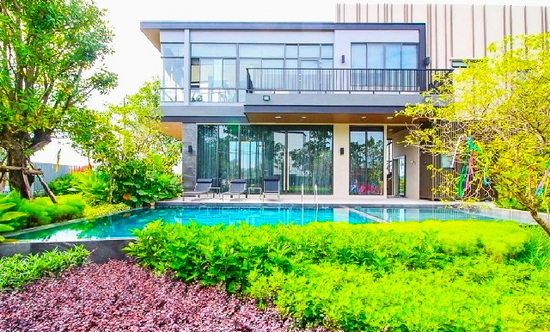 - ตรงข้ามบ้านเป็นสระว่ายน้ำส่วนกลาง และสวน
