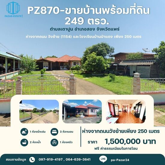 ขายบ้านพร้อมที่ดิน 249 ตรว. ห่างจากถนน วังซ้าย (1154) และโรงเรียนบ้านป่าแดง เพียง 250 เมตร ตำบลเตาปูน อำเภอสอง จังหวัดแพร่