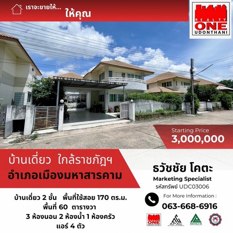 บ้านเดี่ยว 2 ชั้น โครงการ วิลล่า นารา เฟส 1 ใกล้ มหาวิทลัยราชภัฎ มหาสารคาม