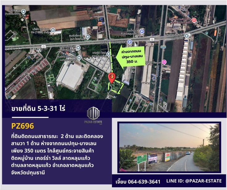 PZ696-ขายที่ดินถมแล้ว 5-3-31 ไร่ ห่างจากถนนปทุม-บางเลนถนนสาย 346 เพียง 350 เมตร ติดหมู่บ้าน เทอร์ร่า วิลล์ ลาดหลุมแก้ว จังหวัดปทุมธานี